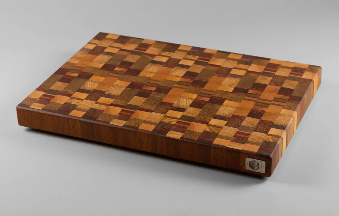Chaos is our proposal for a chaotic end grain cutting board. Made with a wide variety of woods.